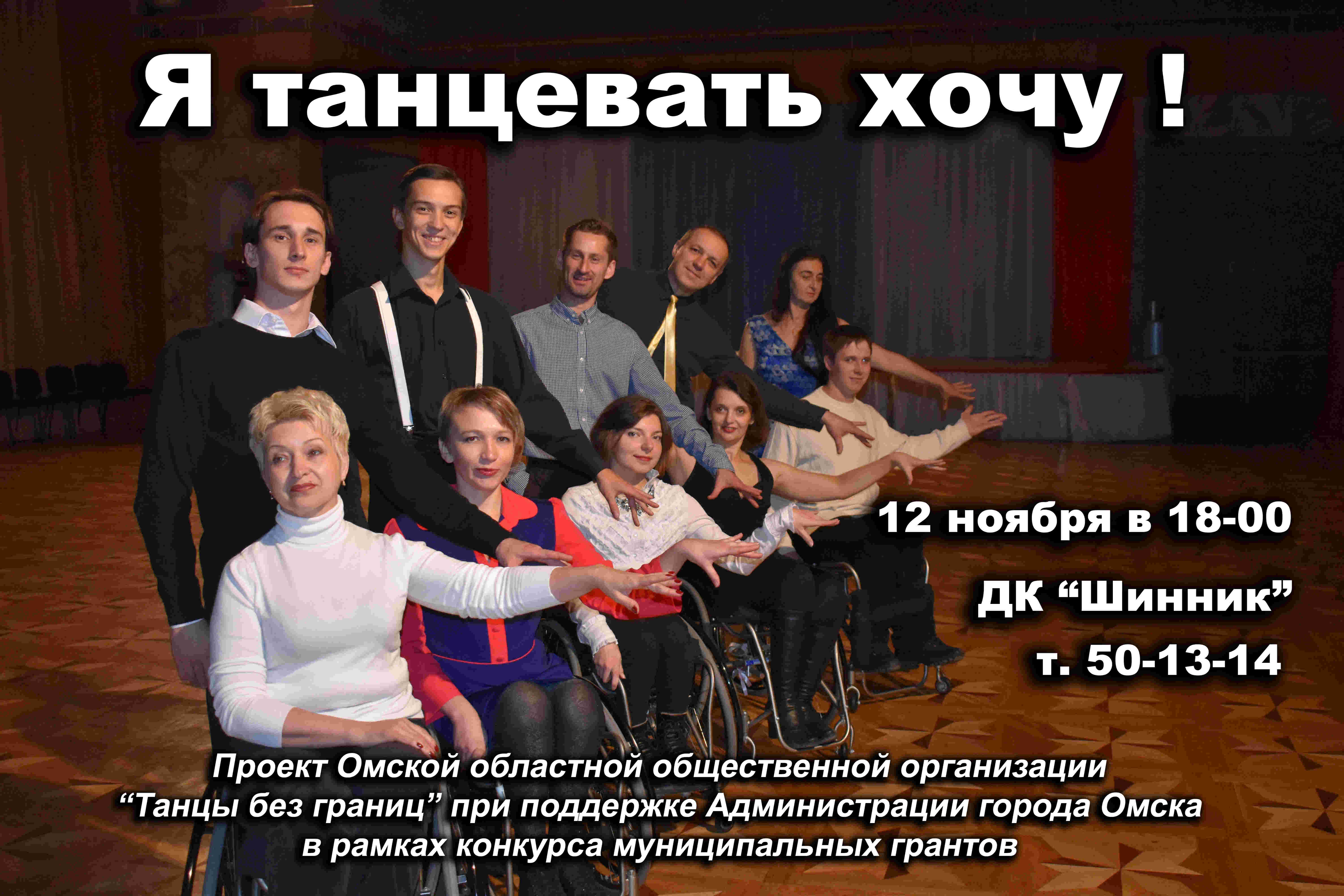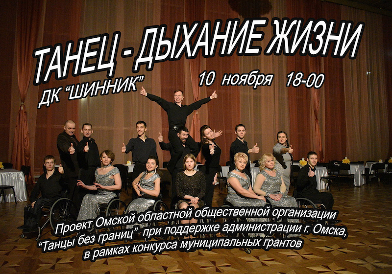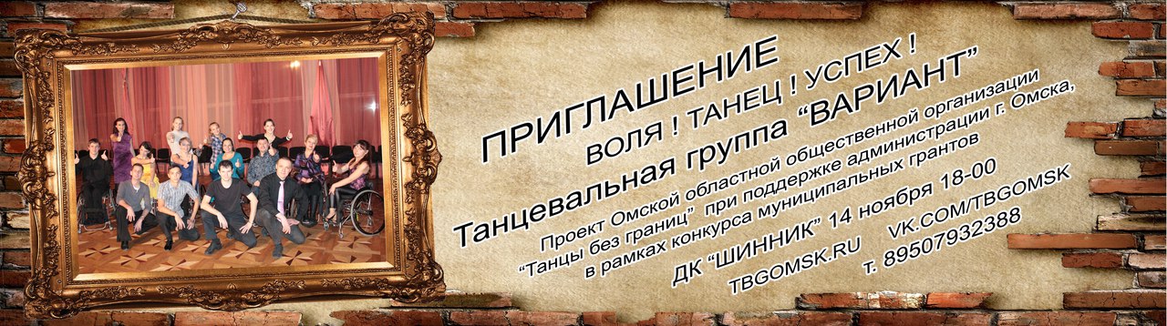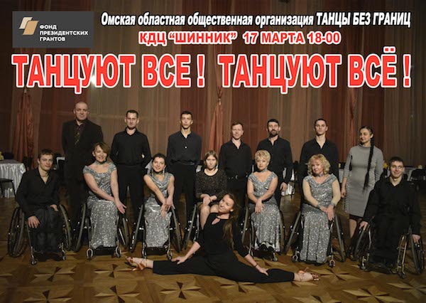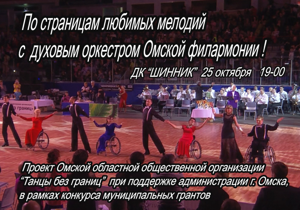 __29.07.2017____ День Омича 2017 ![]() __01.06.2017____ Омская областная общественная организация "Танцы без границ" информирует о начале работы над проектом "С танцем по жизни". К участию в проекте приглашаются люди с ограниченными возможностями движения, передвигающиеся на колясках (нарушение опорно-двигательноо аппарата) при наличии медицинской справки допускающей занятия танцами на колясках, а также танцоры (спортивные танцы) и волонтеры. __01.03.2017____ РОДНЫЕ ГОРОДА - 2017 (анонс проекта)