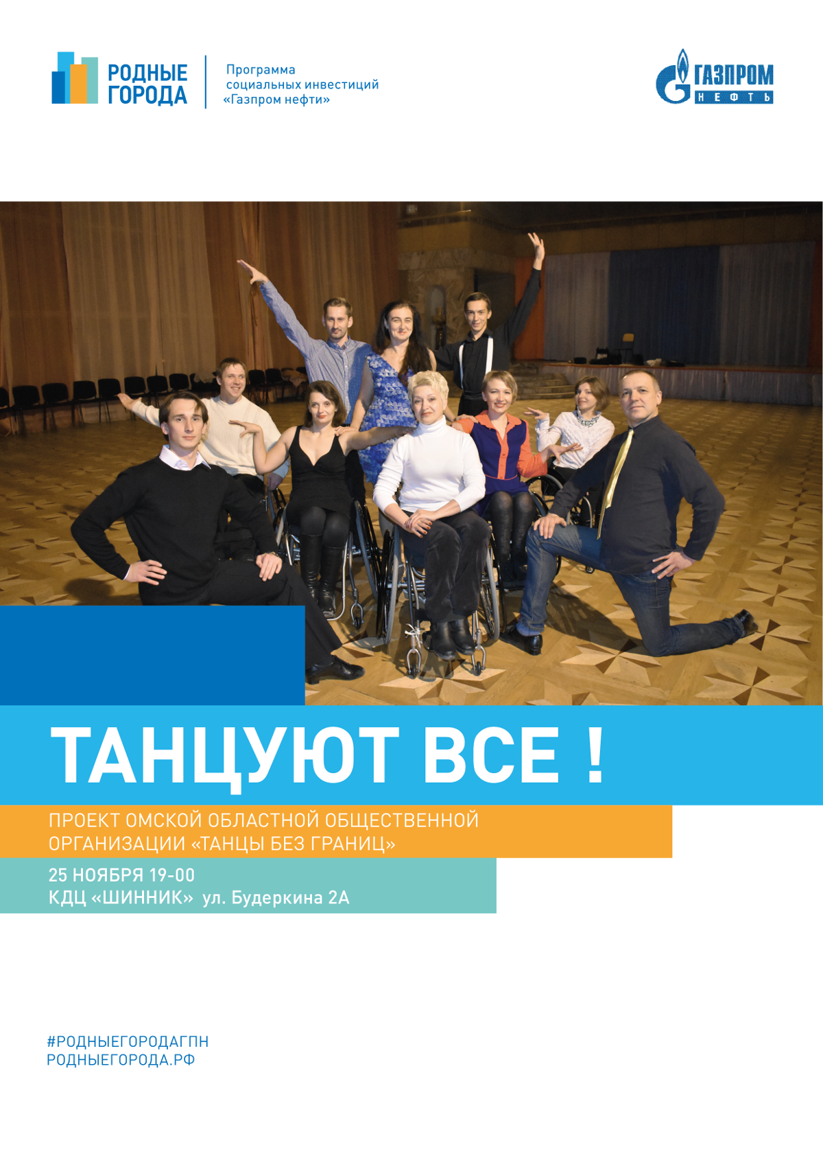 РОДНЫЕ ГОРОДА - 2017 Анонс проекта МАСТЕР КЛАСС __25.11.2016____ ТАНЦУЮТ ВСЕ ! Зрители проекта «Танцуют все» увидят премьеру - «латиноамериканский формейшн», это командный танец, состоящий из пяти танцев латиноамериканской программы : самба, румба, ча-ча-ча, пасодобль и джайв, исполняемый танцорами на колясках. Также на суд зрителей будет представлен испанский танец фламенко. Фламенко-это отношение к жизни: возможность понять свою земную долю, чувствуя каждый миг не в мыслях, а своим существом. Это восторг и вкус к жизни, принятие мира и себя с надеждой, любовью и верой. Омские хореографические коллективы, различных танцевальных направлений порадуют своим выступлением гостей и участников проекта. Поддержка проекта осуществлена на средства, предоставленные Компанией «Газпром нефть» в рамках реализации программы социальных инвестиций «Родные города».