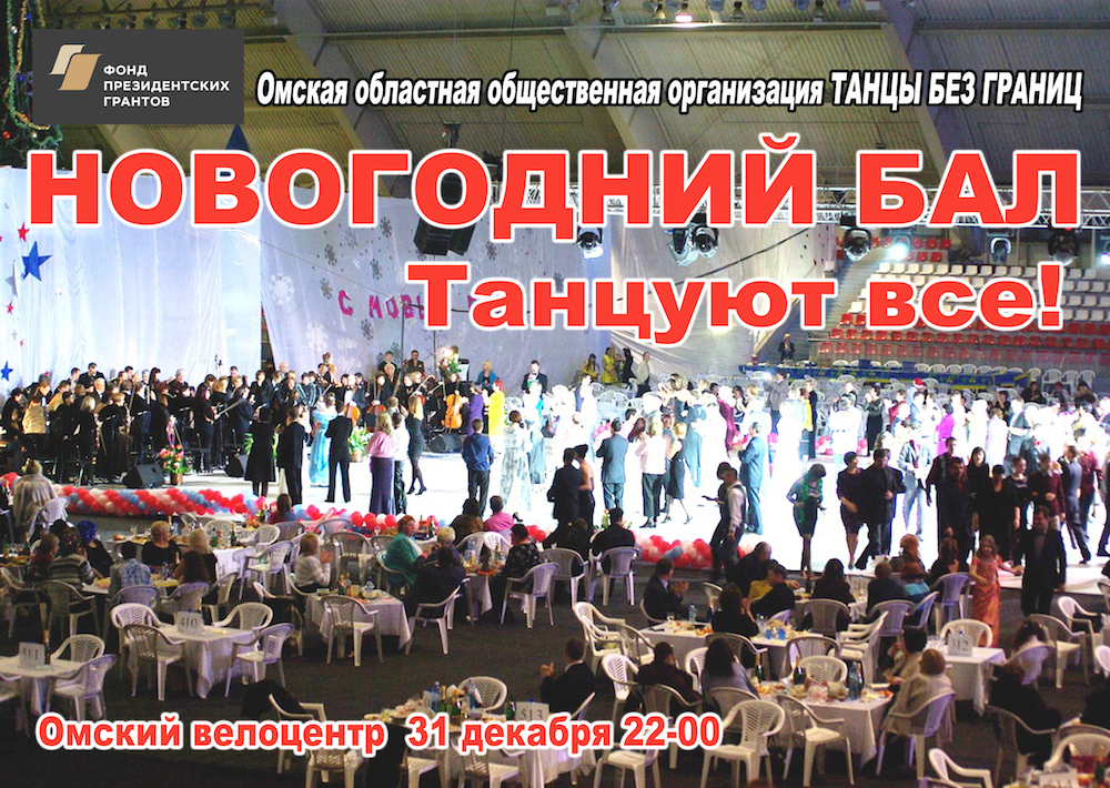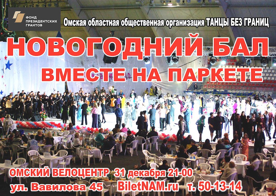 БОЛЬШОЙ НОВОГОДНИЙ БАЛ – 2018 ВМЕСТЕ НА ПАРКЕТЕ ! Любимый праздник в новом формате! 31 декабря 2017 года в 21.00 зал Омского вело-центра (ул. Вавилова 45/1) превратится в самую большую новогоднюю танцевальную площадку Омска. Здесь состоится грандиозный праздник - Большой городской Новогодний Бал! Бал порадует омичей живой музыкой и новогодней дискотекой. Концертный оркестр Омской филармонии откроет программу танцем «Полонез» и мелодиями в танцевальных ритмах. Программа новогоднего бала предполагает массу приятных сюрпризов, выступления известных омских танцоров, певцов, музыкантов. Конечно же, какой Новогодний Бал без Деда Мороза, знающего толк в танцах? Гость вечера Дед Мороз разучит с гостями танцевальные па… Рекомендованный dresscode для гостей бала: вечерний костюм, вечернее платье или оригинальный новогодний костюм. Работает гардероб. Сбор гостей в 21-00 Начало выступления оркестра Омской филармонии под управлением Олега Романова в 22-00 Завершение Бала 1 января 2018 года в 04-00 утра. Участникам и зрителям бала будут предложены места за небольшими журнальными столиками на четверых. Сервировать свой столик Вы можете самостоятельно, так же будет работать буфет. Прибыть на Бал можно не только к началу, но и после полуночи. Если у Вас есть белое платье в пол, и Вы согласны принять участие в церемонии открытия Бала танцем «Полонез», то Вы получаете приглашение на Бал бесплатно. Организатором Бала выступает Омская областная общественная организация «Танцы без границ» при поддержке фонда Президентских грантов. После завершения Бала заказывайте такси в компании «Юнис-Лада» по тел. 60-60-60. План расположения столиков размещен на сайте BiletNAM.ru Прекрасная возможность для встречи нового года корпоративно. НОВОГОДНИЙ БАЛ ждет Вас! До встречи в новогоднюю ночь! Телефон для справок 50-13-14. __18.11.2017____