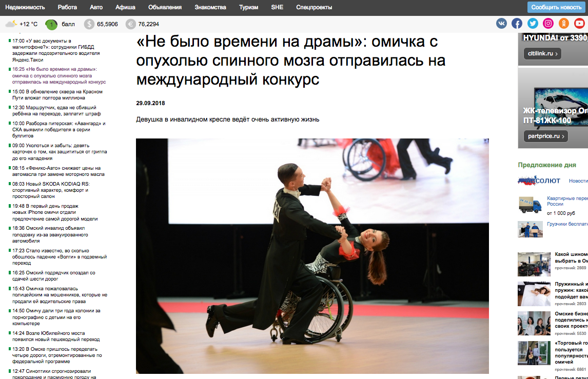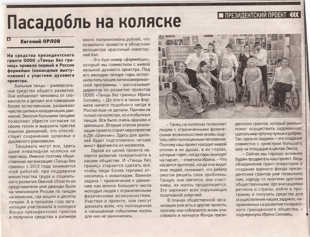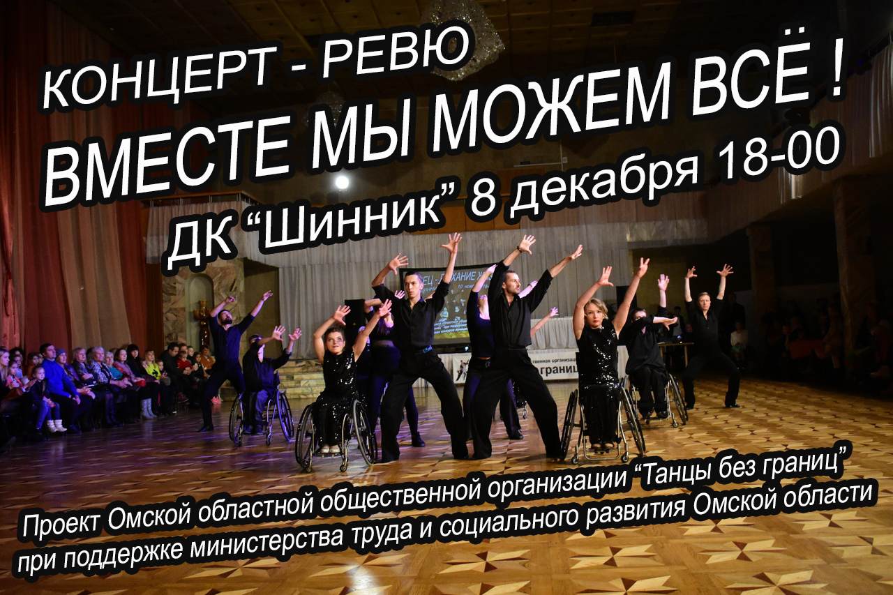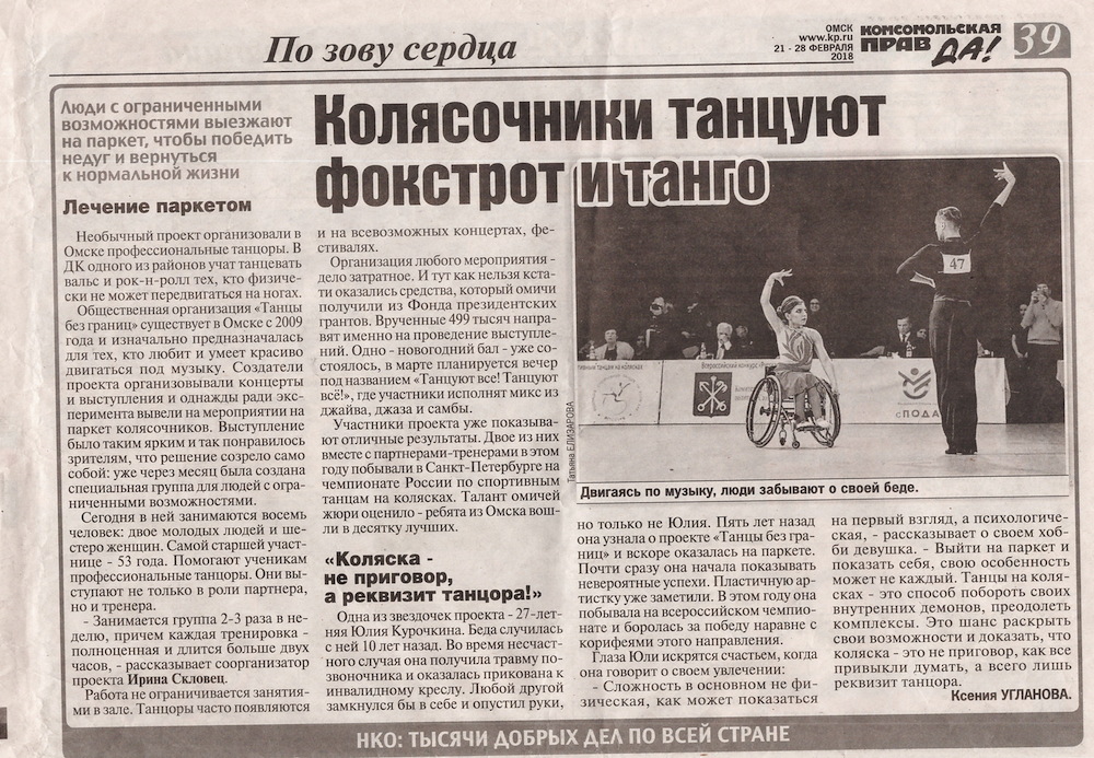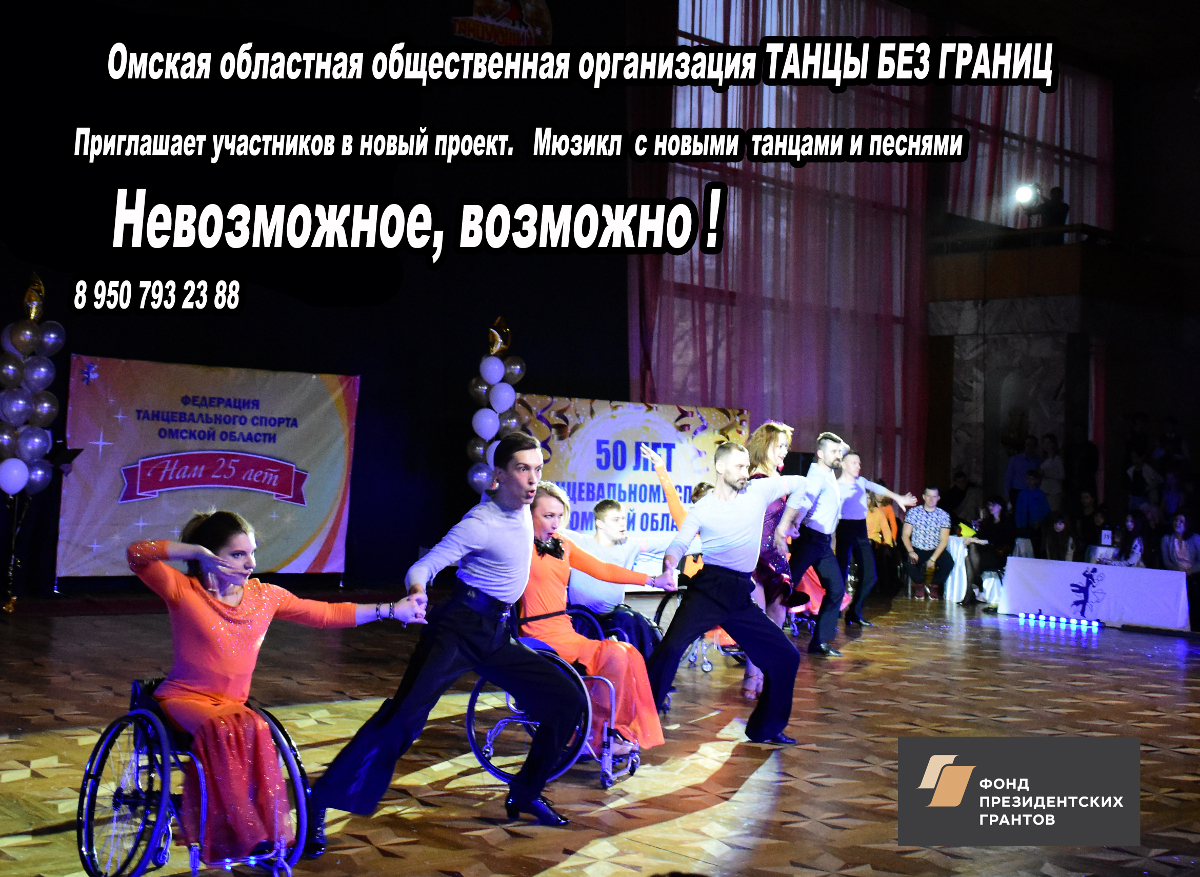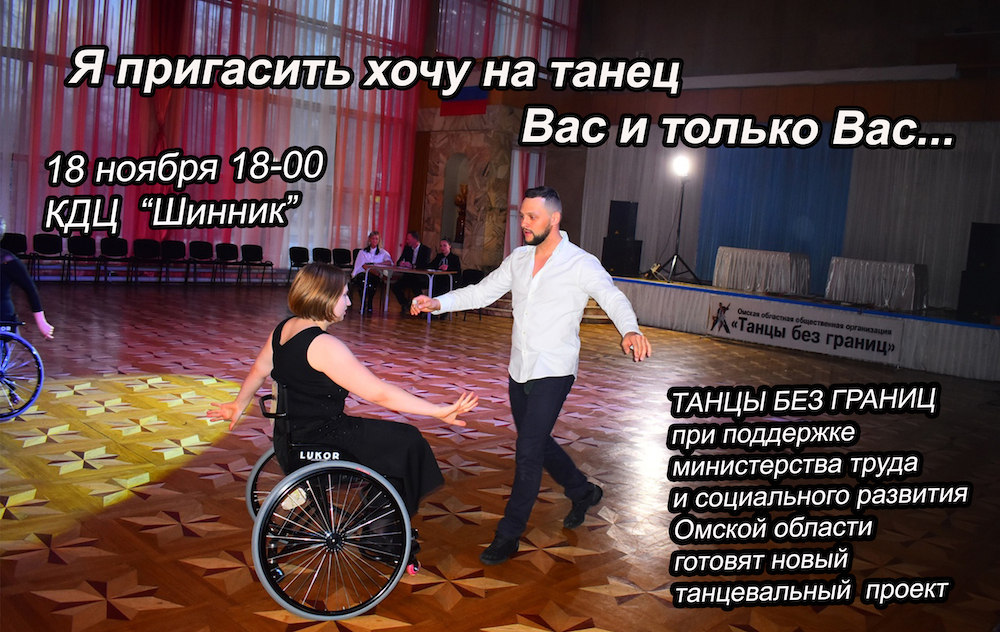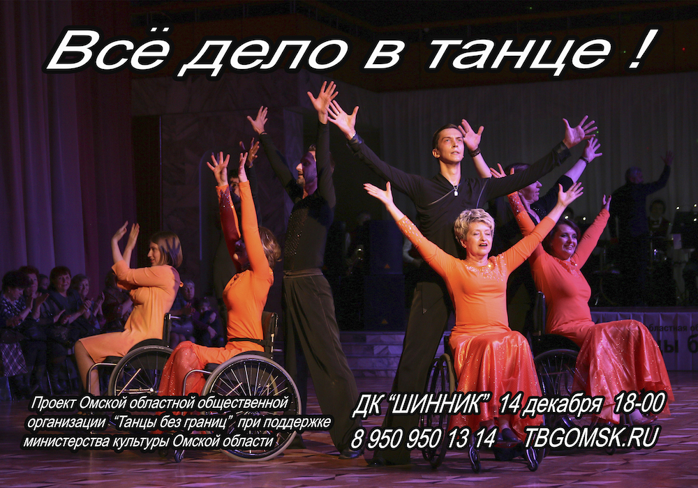 ПРЕССА О ТАНЦАХ БЕЗ ГРАНИЦ __10.12.2018____ ![]() НОВОГОДНИЙ БАЛ! ТАНЦУЮТ ВСЕ! __30.11.2018____ ![]() НАШИ ЧЕМПИОНЫ РОССИИ! УРА! __14.11.2018____ ![]() 8 декабря 2018 года в 18-00 в КДЦ «Шинник» Ревю «Вместе мы можем всё». Ревю – представление, в которых сочетаются музыка и танцы, состоящее из отдельных номеров, объединенных между собой общей темой. Участники Ревю не только танцоры на колясках, но и профессиональные танцоры различных танцевальных направлений. Наши зрители увидят две новые хореографические композиции на музыку из мюзиклов, исполняемые танцорами на колясках, а также две ранее подготовленные хореографические композиции. Ревю «Вместе мы можем всё» это первое выступление Омской областной общественной организацией «Танцы без границ» в новом формате. Приглашаем всех любителей танцев посетить 8 декабря 2018 года в 18-00 КДЦ «Шинник» и полюбоваться творчеством сильных духом людей на Концерте-Ревю «Вместе мы можем всё». Приходите к нам. Зарядитесь позитивом и умением радоваться жизни у участников нашего проекта. Мы ждем Вас. __01.10.2018____ Видео при клике на картинку ![]() «Танец - дыхание жизни!» 10 ноября 2018 года в 18-00 в КДЦ «Шинник» пройдет фестиваль «Танец-дыхание жизни!», организованный Омской областной общественной организацией «Танцы без границ». В рамках реализации проекта - победителя конкурса муниципальных грантов проведены занятия танцами на колясках для людей с ограниченными возможностями движения. Итогом социального проекта «Танец - дыхание жизни!» станет фестиваль, на котором выступят не только танцоры на колясках, но и профессиональные танцоры различных танцевальных направлений. Наши зрители увидят две новые хореографические композиции, исполняемые танцорами на колясках: одна из которых исполняется под неаполитанскую песню. Также на суд зрителей будут представлены хореографическая композиция на музыку из мюзикла «Нотер дам де Пари» и зажигательный Рок-н-ролл. Да!Да! Вы правильно прочитали Рок-н-ролл на танцевальных колясках -это реально. Ведь в составе нашего коллектива две пары, вошедшие в десятку лучших на Кубке Континентов, прошедшем в сентябре 2018 года в городе Санкт-Петербург. Приглашаем всех любителей танцев посетить 10 ноября 2018 года в 18-00 КДЦ «Шинник» и полюбоваться творчеством сильных духом людей на фестивале «Танец - дыхание жизни!». Приходите к нам. Зарядитесь позитивом и умением радоваться жизни у участников нашего проекта. Мы Вас ждем. __29.09.2018____ Пресса о Юлии Курочкиной Читайте здесь ![]() __11.09.2018____ Поздравляем Юлию Курочкину Дмитрия Рылова, Алексея Голикова Наталью Ровенскую, с успешным выступлением на международных соревнованиях КУБОК КОНТИНЕНТОВ Видео выступлений здесь ![]() __08.09.2018____ Танцевальное РЕВЮ Видео смотрите здесь ![]() https://yadi.sk/i/zT9Bjm0jzifEFg __04.08.2018____ Участники танцевальной группы на колясках Юлия Курочкина Дмитрий Рылов, Наталья Ровинская Алексей Голиков на дне города 4 августа 2018 года выступали в концертном номере вместе с заслуженной артисткой России Светланой Бородиной и Омским симфоническим оркестром Видео выступления смотрите здесь