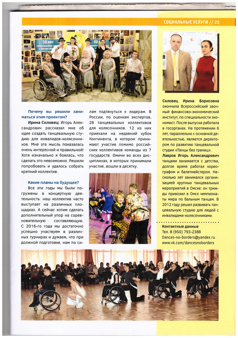 __26.09.2020____ Видео ДИАХРОМНОЕ ТАНГО версия 12 канала. Омское областное телевидение Видео ДИАХРОМНОЕ ТАНГО вконтакте Видео ДИАХРОМНОЕ ТАНГО на ютуб __24.06.2020____ ВЕЧЕРНИЙ ОМСК о том, как все начиналось... __10.03.2020____ __01.01.2020____ Большой новогодний Бал! По страницам любимых мюзиклов! Смотрите выступления наших звезд здесь... __02.12.2019____ В последний час! Германия Бонн, Юлия Курочкина Дмитрий Рылов, бронзовые призеры Чемпионата мира по спортивным танцам на колясках в латиноамериканской программе танцев при участии 26 стран ! БРАВО ! __17.11.2019____ Поздравляем Курочкину Юлию Рылова Дмитрия победителей Чемпионата России по спортивным танцам на колясках! __12.11.2019____ __25.10.2019____ Видео проекта здесь __10.09.2019____ Поздравляем победителей Кубка мира по танцам на колясках. Браво Омичи ! __08.08.2019____ Омская Губерния Портал Правительства Омской области о новом проекте общественной организации ТАНЦЫ БЕЗ ГРАНИЦ __10.07.2019____ Заявка на участие в проекте 1. Имя...? 2. Год рождения...? 3. Контактная информация: адрес электронной почты, телефон...? 4. Статус участника...? ( танцор, танцор на коляске, человек передвигающейся на коляске, желающий научится танцевать) нужное подчеркнуть или указать свой вариант. Отбор участников проекта пройдет 28 августа с 19.00 до 20.00 по адресу г. Омск, ул. Будеркина,2 КДЦ «Шинник» dances-no-borders@yandex.ru 89507932388 __15.04.2019____ ПЕРВЫЙ В ИСТОРИИ ОМСКА ОТКРЫТЫЙ ЧЕМПИОНАТ ПО СПОРТИВНЫМ ТАНЦАМ НА КОЛЯСКАХ ЗАВЕРШИЛСЯ ПРОВЕДЕНИЕМ МАСТЕР КЛАССА С УЧАСТИЕМ ЧЕМПИОНОВ МИРА ПО ТАНЦАМ НА КОЛЯСКАХ СЕРГЕЯ АНТОНОВА И АЛЕКСАНДРЫ БЕРДНИК __12.03.2019____ ПРЕЗИДЕНТСКИЙ ГРАНТ, ВИДЕО-АНОНС ПРОЕКТА __18.02.2019____ 13-15 апреля 2019 года Федерация спортивных танцев на колясках проводит мастер- класс по обучению танцам на колясках в г. Омске Мастер -класс проходит при поддержки Фонда Президентских Грантов по программе «Азбука танца на колясках» На мастер- класс приглашаются танцоры на колясках и их партнеры, а так же желающие научится танцевать- инвалиды с нарушением опорно- двигательного аппарата разного возраста и танцоров без инвалидности. Принять участие в мастер классе могут специалисты в области адаптивной физкультуры, тренеры и хореографы. Организацию мастер-класса в городе Омске будет осуществлять Омская областная общественная организация «Танцы без границ» Для участия необходимо заполнить заявочную форму. ( смотрите вложенный файл) и отправить ее по адресу ( dances-no-borders@yandex.ru) Мастер класс будет проходить по адресу: ( г. Омск, ул Дианова,33) Контактное лицо (Скловец Ирина +7 950 793 23 88 Лавров Игорь Александрович +7 904 826 97 63 ) Расписание мастер класса будет опубликовано дополнительно. Информацию о Федерации спортивных танцев на колясках вы можете найти: на сайтеhttp://wdr.ru в группе ВК https://vk.com/wheelchair_dance в группе в фэйсбуке https://www.facebook.com/WDanceRussia/ Заявка на участие в мастер-классе по танцам на колясках г.Омск 13-15 апреля 2019 года. 1. ФИО________________________________________________________ 2. Дата рождения______________________________________________ 3. Контактная информация (в каком городе живете, какую организацию представляете, адрес электронной почты, телефон):_____________________________________________________ 4. Статус участника ( танцор на колясках, специалист в области адаптивной физкультуры, тренер, хореограф, желающий научиться танцевать на коляске) нужное подчеркнуть или написать свой вариант_______________________________________________________ __24.01.2019____