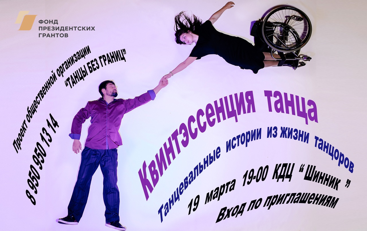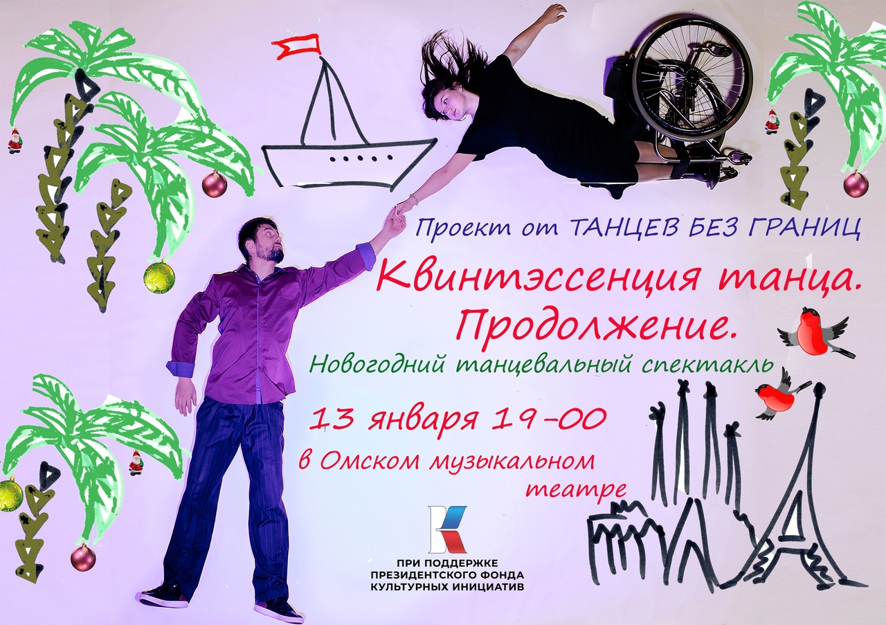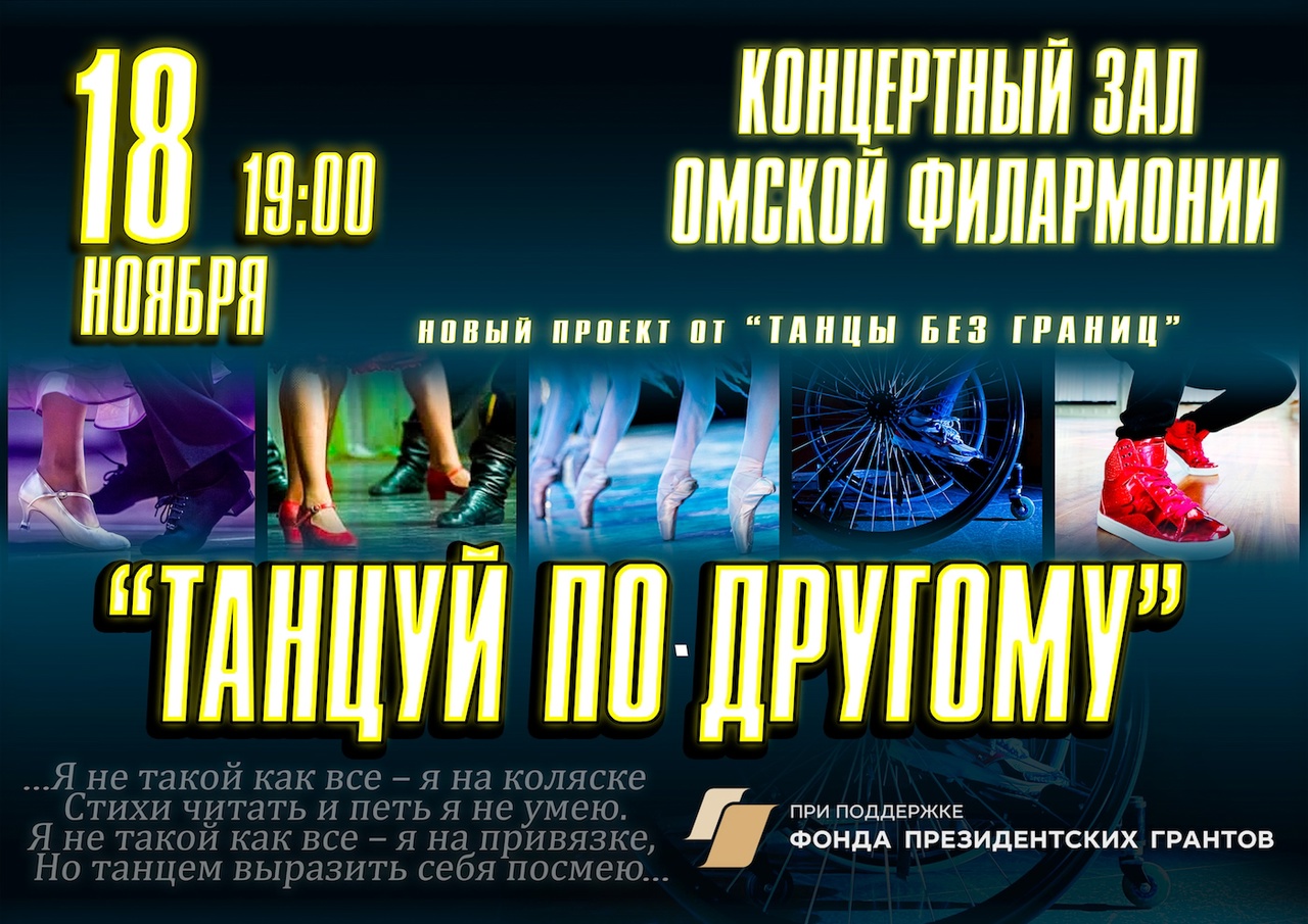 __25.12.2024____ Отработали совместное исполнение танцорами-партнерами и танцорами на колесках танца-игры "Ремешок". Получилось неожидано весело и интересно. Этим танцем мы однозначно удивим зрителей. Только благодаря поддержке Президентским фондом культурных инициатив наши зрители увидят хореографическую сказку "Танцевальные узоры России" __16.12.2024____ Мы приняли участие в конкурсе "Мой добрый бизнес" и сегодня получили звезду победителя "Лучший проект в номинации Культурный код" и наш Проект перешел на межрегиональный этап. __11.12.2024____ Мы приняли участие в конкурсе "Мой добрый бизнес" и сегодня получили звезду победителя "Лучший проект в номинации Культурный код" и наш Проект перешел на межрегиональный этап. __29.11.2024____ Незаметно подошел к завершению 1 этап нашего самого необычного проекта - хореографическая сказка, "Танцевальные узоры России" Это наша первая сказка хоть и хореографическая. благодарим за поддержку Президентский фонд культурных инициатив. Мы провели 16 групповых репетиций на которых участники проекта изучиди фигуры нескольких народных танцев, доработали сценарий и получили звуковые файлы от аранжировщика, под которые мы проводим свои репетиции __12.11.2024____ Сегодня в Международном мультимедиацентре «Евразия сегодня» у нас прошла пресс-конференция, посвящённая проекту «Танцуй по-другому», созданному при поддержке Фонда президентских грантов. В пресс-конференции приняли участие: __26.10.2024____ Спектакль "Танцуй по-другому", созданный при поддержке Фонда президентских грантов меньше чем через месяц покажем на сцене Концертного зала Омской филармонии . Мы пригласили поучаствовать в проекте актера Омского Драматического театра Степана Дворянкина. Это риск , что актер перетянет на себя внимание,но его участие может дать проекту новый импульс и мы рискуем. Степан тоже рисковал своим творческим именем Степан Дворянкин "Я часто сейчас отказываюсь от новых проектов ввиду полного отсутствия свободного времени. Но тут прекрасная Юлия Курочкина просто меня очаровала, не оставив выбора. Юля, станцуем. Всем участникам удачи и крыльев за спиной!"