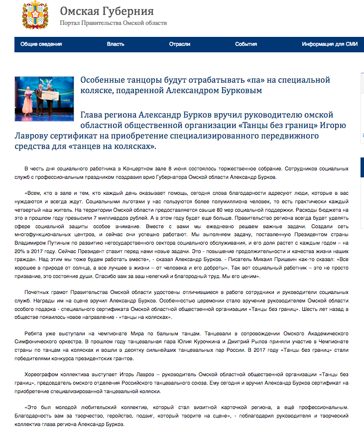 __08.06.2018____ Вручение сертификата на приобретение специализированной танцевальной коляски, ВРИО губернатора Омской области Александром Бурковым ТАНЦАМ БЕЗ ГРАНИЦ... Видео при клике на изображение ![]()