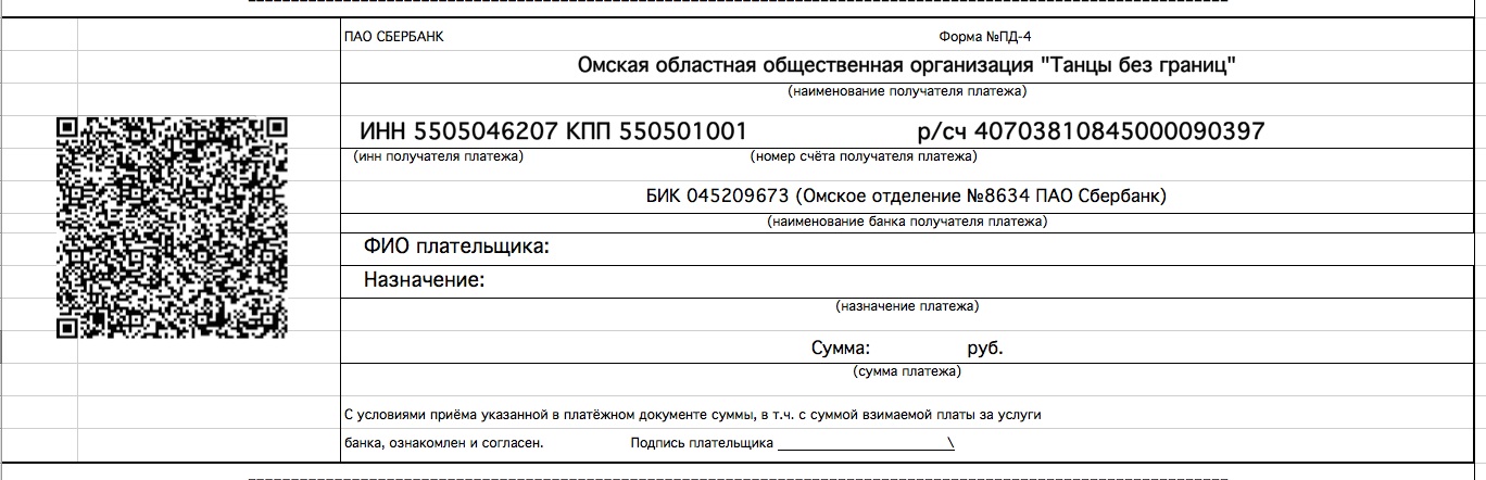 Получатель: Омская областная общественная организация «ТАНЦЫ БЕЗ ГРАНИЦ» ИНН\КПП 5505046207\550501001 Р/С 40703810845000090397 Омское отделение №8634 ОАО "Сбербанк России" Р/С 40703810645000000749 Омское отделение №8634 ОАО "Сбербанк России" спец. счет К/С 30101810900000000673 БИК: 045209673 Юр. Адрес: 644121 Омск. ул. Труда 49-14 Рук. Президент Лавров Игорь Александрович (действующий на основании устава) Перейти в сбербанк онлайн Распечатайте квитанцию, поднесите штрих код к считывателю банкомата сбербанка Квитанция Штрих код Штрих код |